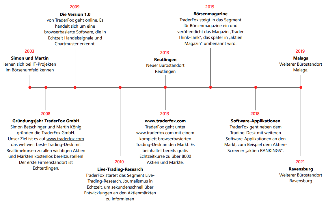 Die TraderFox GmbH wurde 2007 von Simon Betschinger und Martin König gegründet. Mittlerweile arbeiten über 50 Mitarbeiter für TraderFox. Unsere festen Bürostandorte sind Reutlingen und Ravensburg.